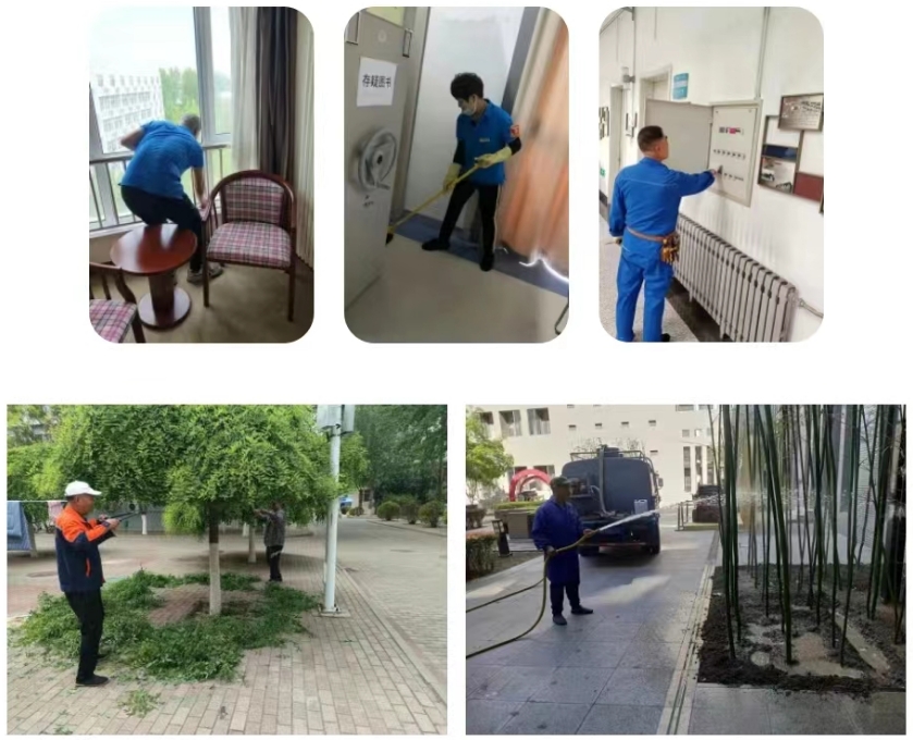 两校区物业绿化员工在假期间积极清整校园环境卫生,做好校园设施维修工作。绿化员工不辞辛劳,修剪草木、修整绿地,美化校园环境,用行动铸就五一校园最靓的风景。