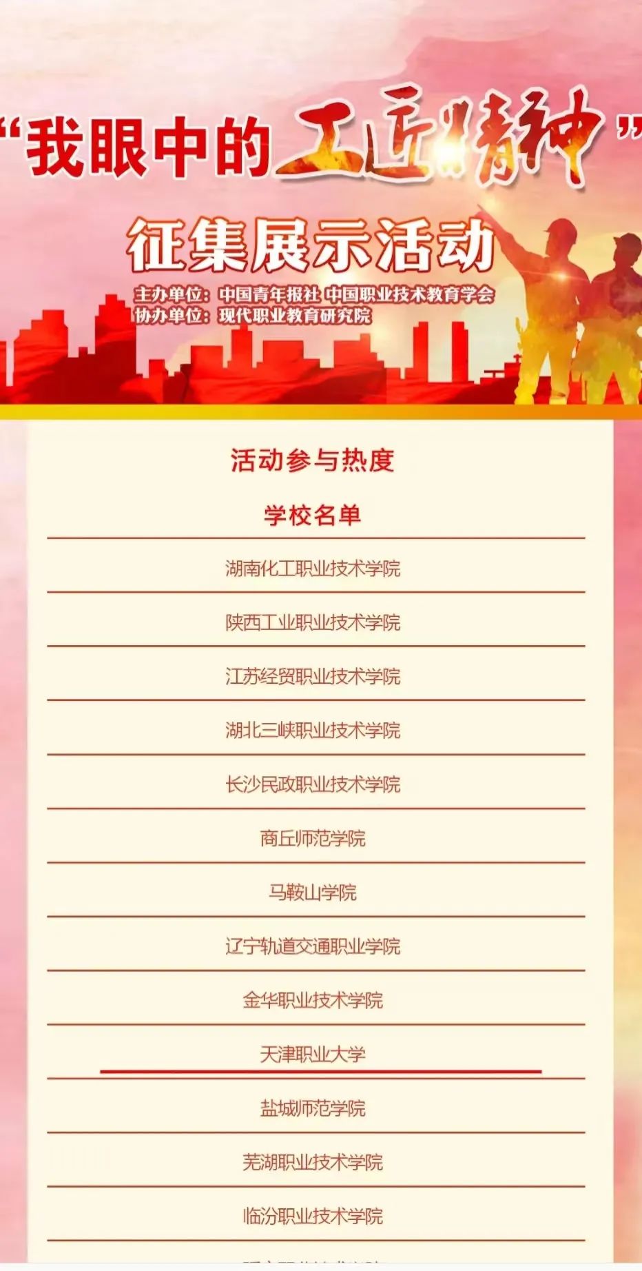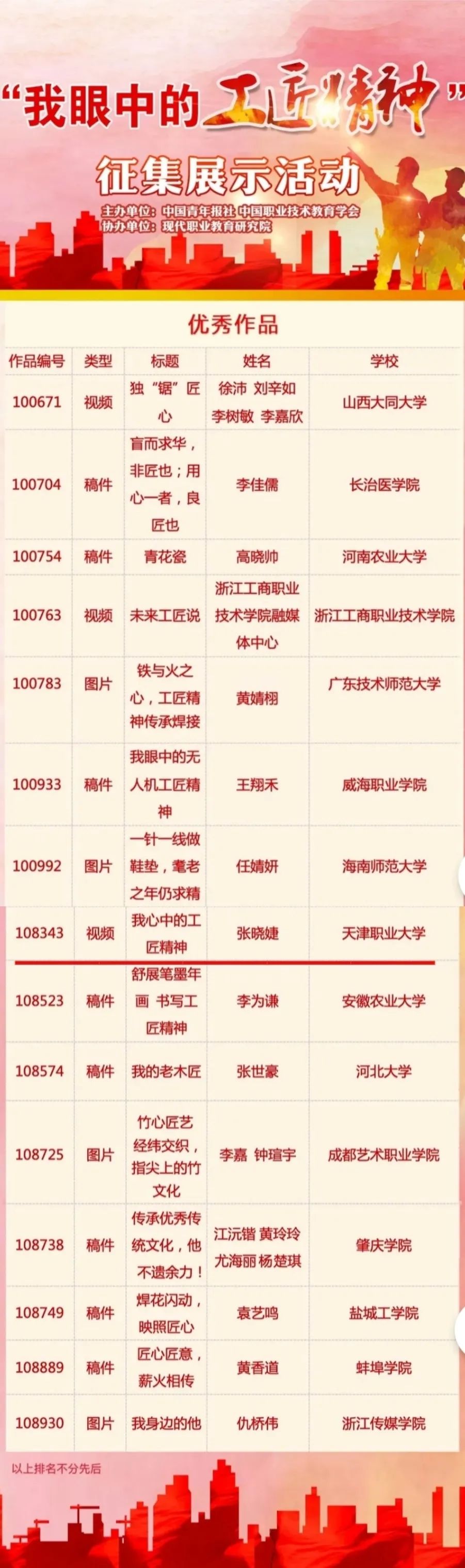 2023年11月,中国青年报社、中国职业技术教育学会主办,现代职业教育研究院等单位举办了“我眼中的工匠精神”征集展示活动,beat365组织师生积极参与,总共报送作品共104份,近期承办单位已完成优秀作品征集工作。beat365活动参与热度排在前20,张晓婕老师提交的视频作品《我心中的的工匠精神》入选优秀作品,评选结果已进行公示。