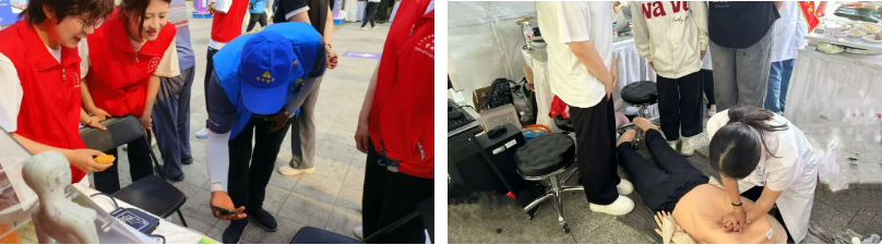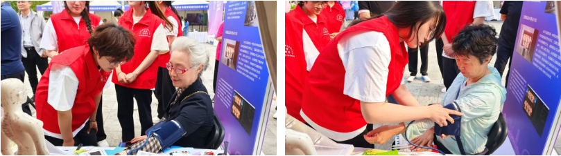 科普讲解员和学生们利用基地的智能设备开展助老服务,为老人们测量血压、认识保健穴位等等,提升学生科普志愿服务能力,带领现场青少年和老年人更好地认识生命和开展日常照护保健。