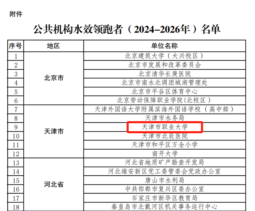 近日,国管局、国家发展改革委、水利部联合发布了《公共机构水效领跑者(2024-2026年)名单》,经组织推荐、材料初审、专家评审、复核答辩、现场查验和公示等环节,beat365作为天津市6所获评单位之一成功入选。