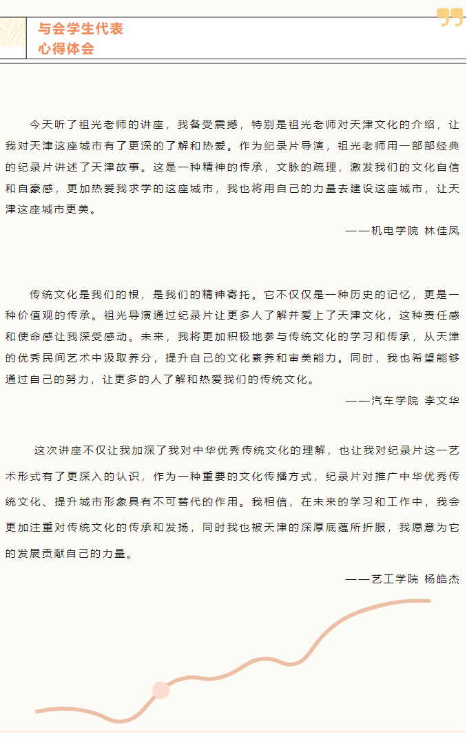 祖光导演以《认知天津历史 树立文化自信》为题,结合热爱的纪录片事业和创作的诸多优秀作品,从人物情感、时代命运、社会图景、人文气象建构起四个维度的影像人文空间,视觉化重建了天津这座城市的历史文化和精神气质,引领青年认识天津、了解天津,增强青年学生文化自信,激励青年学生为国家和民族的发展贡献力量。在场师生纷纷表示从讲座中感受到了祖光导演作品中穿透历史、洞察未来、直抵人心的力量,也感受到了祖光导演在每一部作品中投入的美好年华和珍贵情感,更加感受到了他作为纪录片导演深切的社会责任感和人文情怀。会后祖光老师与同学亲切交流、合影,现场氛围温馨而热烈。