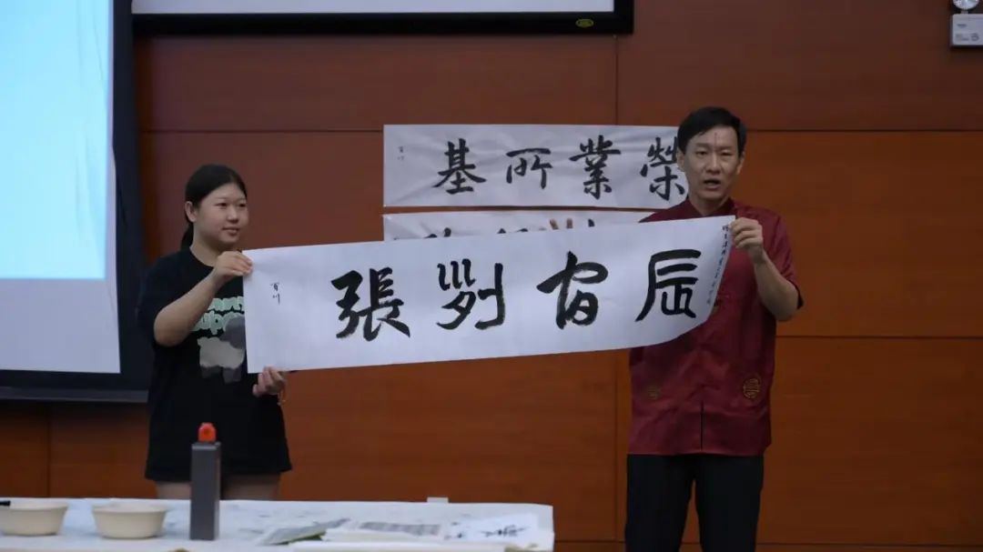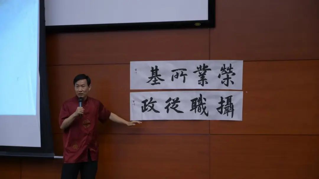 陈百川老师以“学习国学智慧,增强大学生修养”为题,用问题式情景教学的方式导入,用生动的语言和详实的案例,将听众带入了浓厚的国学氛围之中。他强调了国学在中华民族历史长河中的重要地位和深远影响,随后围绕《千字文》的形成过程、行文逻辑、蕴含的哲理进行了详细阐述,并重点介绍了《千字文》独有的文字优美、内容丰富、哲理深刻、结构严谨、韵律和谐以及书法艺术价值高六个方面的特色。为了让师生们更直观地感受《千字文》的书法艺术价值,陈百川老师现场进行了书法展示。他挥毫泼墨,一气呵成,写下了精美的书法作品并将书法作品赠送给了在场的同学,并鼓励同学们深入学习国学文化,传承和弘扬中华优秀传统文化,深切感受中华优秀传统文化的博大精深,认识到国学文化的魅力所在,增强对传统文化的认同感和自豪感。