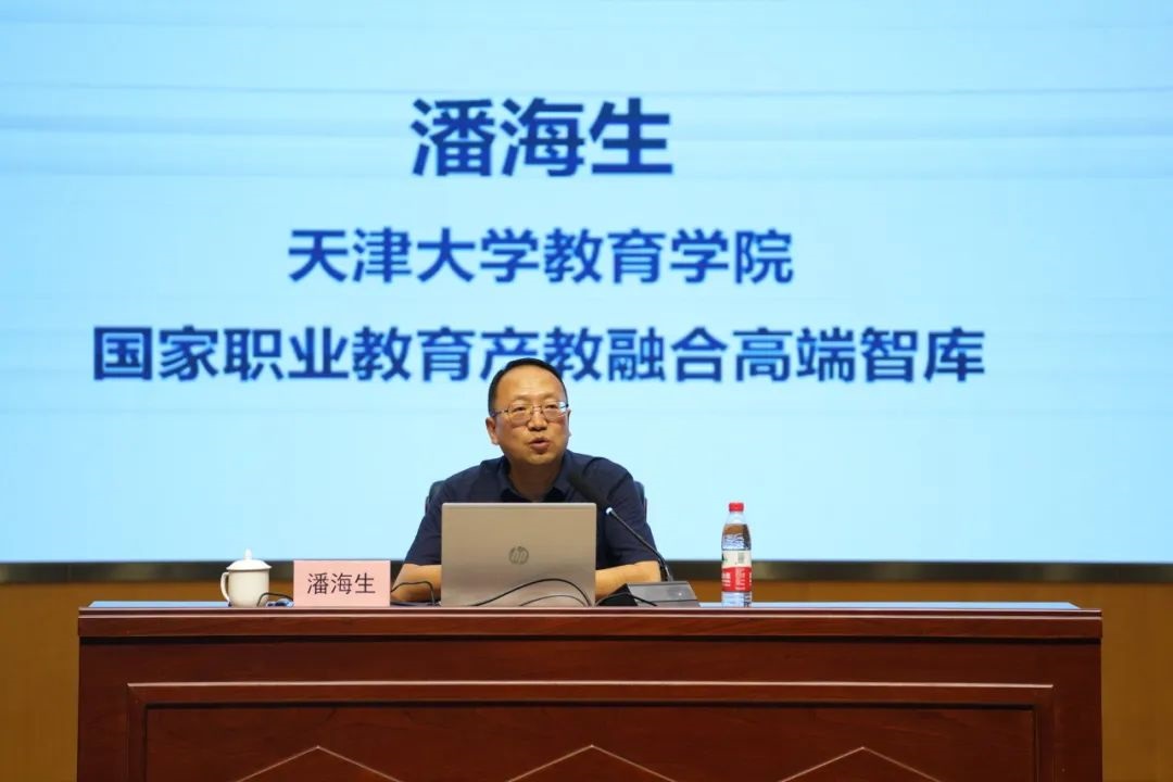 天津大学讲席教授、博士生导师、国家职业教育产教融合高端智库主任潘海生作题为《新双高背景下的高职院校高质量发展路径》的专题辅导报告。