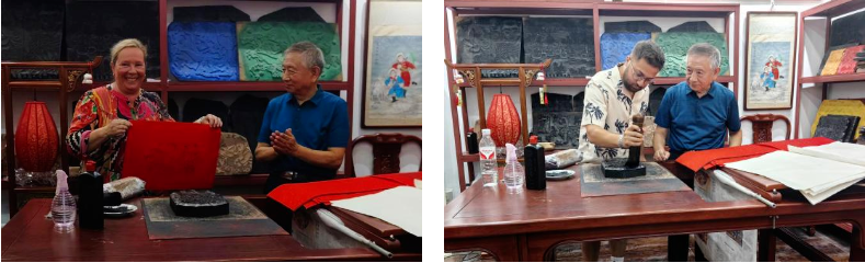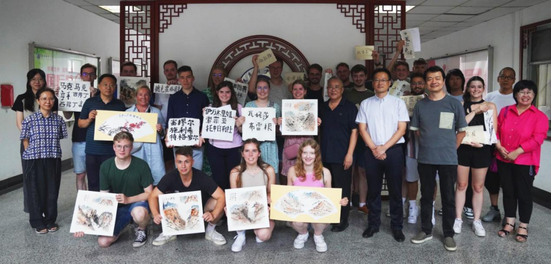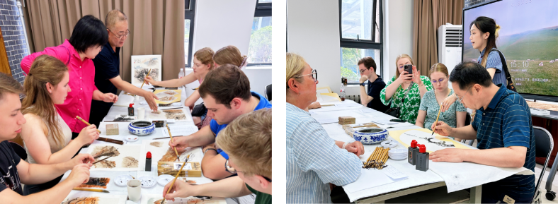 此外,德国学生们还在艺工学院专业教师的悉心指导下,深入体验了中国传统书画的魅力。他们运笔挥毫,尝试着将竹子画得栩栩如生;一幅幅山水画也在笔下缓缓展开,在笔墨浓淡之处,刻画山川河流。不仅如此,他们还饶有兴趣地尝试了用中文书写自己的名字,在一笔一划间,探索汉字意蕴。
