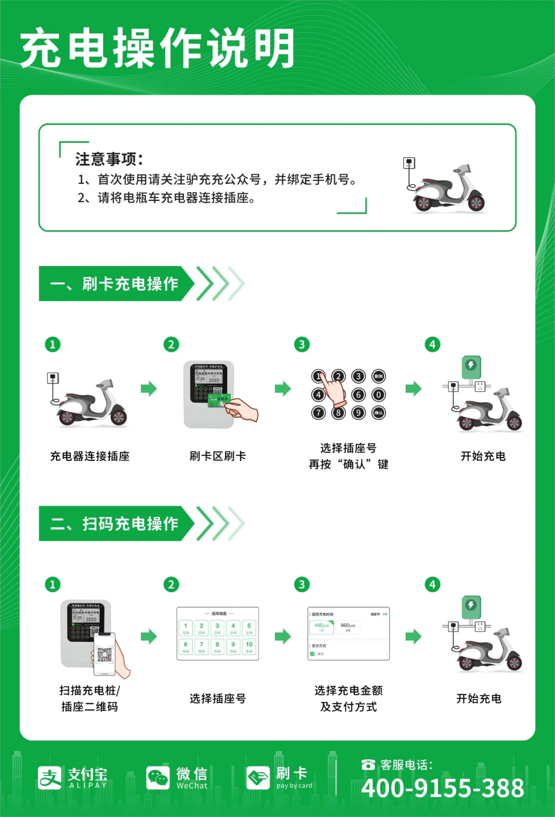 在第13学生公寓北侧车棚设置有40个充电点位、1台充换电柜,在南门西侧车棚设置20个充电点位。设备为直流充电桩,可适应大部分车型电动自行车充电需求。支持手机APP、支付宝等多种费用支付方式,收费标准为:1.105元/度(电费0.505元/度,服务费0.6元/度)。充电车棚设施设备使用请详见车棚内使用流程或参考附图流程进行操作。充电完成后系统会自动发送提示信息,接提示后请师生员工及时将车辆移出充电车棚。