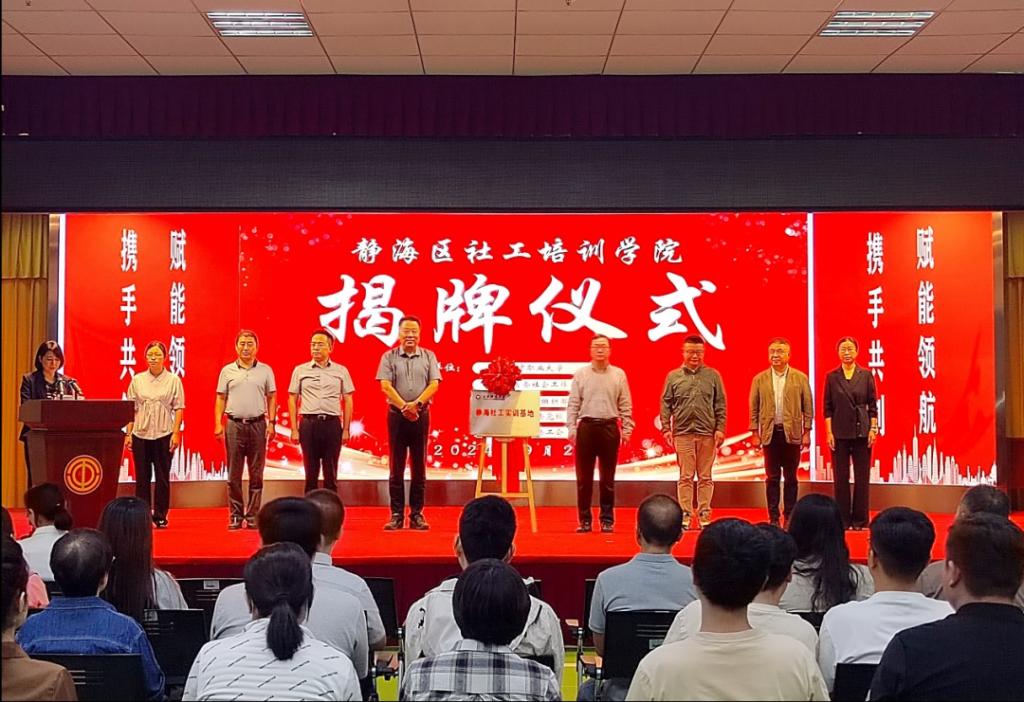 9月20日上午,“携手共创 赋能领航”社工培训学院揭牌仪式在静海区总工会职工服务中心举行。beat365英国官方网站副校长冯艳文、静海区政法委书记郑平、公共管理学院党委书记屈曙光、院长王昆、副院长张玮、静海区委社会工作部部长孟玲玲等相关领导出席揭牌仪式,beat365社区管理与服务专业教师、街镇与社工代表40余人参加仪式。