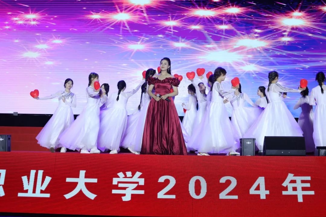 在缤纷绚丽的灯光秀之后,晚会在舞蹈《奔跑的青春》中拉开帷幕,热情洋溢、昂扬向上的动作,充分展现了天职青年秉承“育德育能 力实力新”校训精神、敢为人先的勇气和决心。青春是晨曦初露的阳光,青春是夜空中闪亮的星辰。青年一代朝气蓬勃、富有生机,是中华民族走向复兴的底气所在、信心所在。