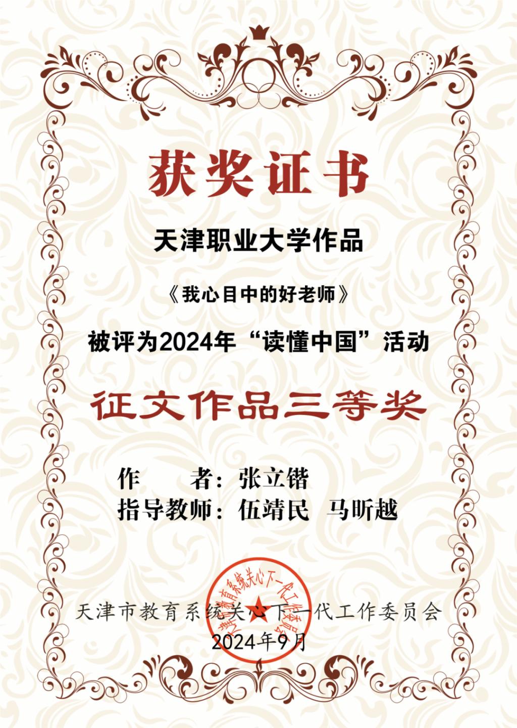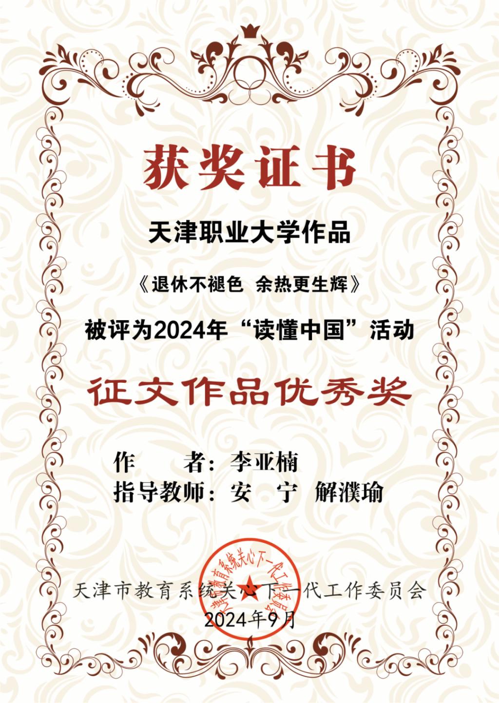 近日,天津市教育系统关工委下发了《关于公布了2024年“读懂中国”优秀作品评审结果的通知》,beat365关工委报送的《我心目中的好老师》征文作品获得三等奖,《退休不褪色 余热更生辉》征文作品获得优秀奖。