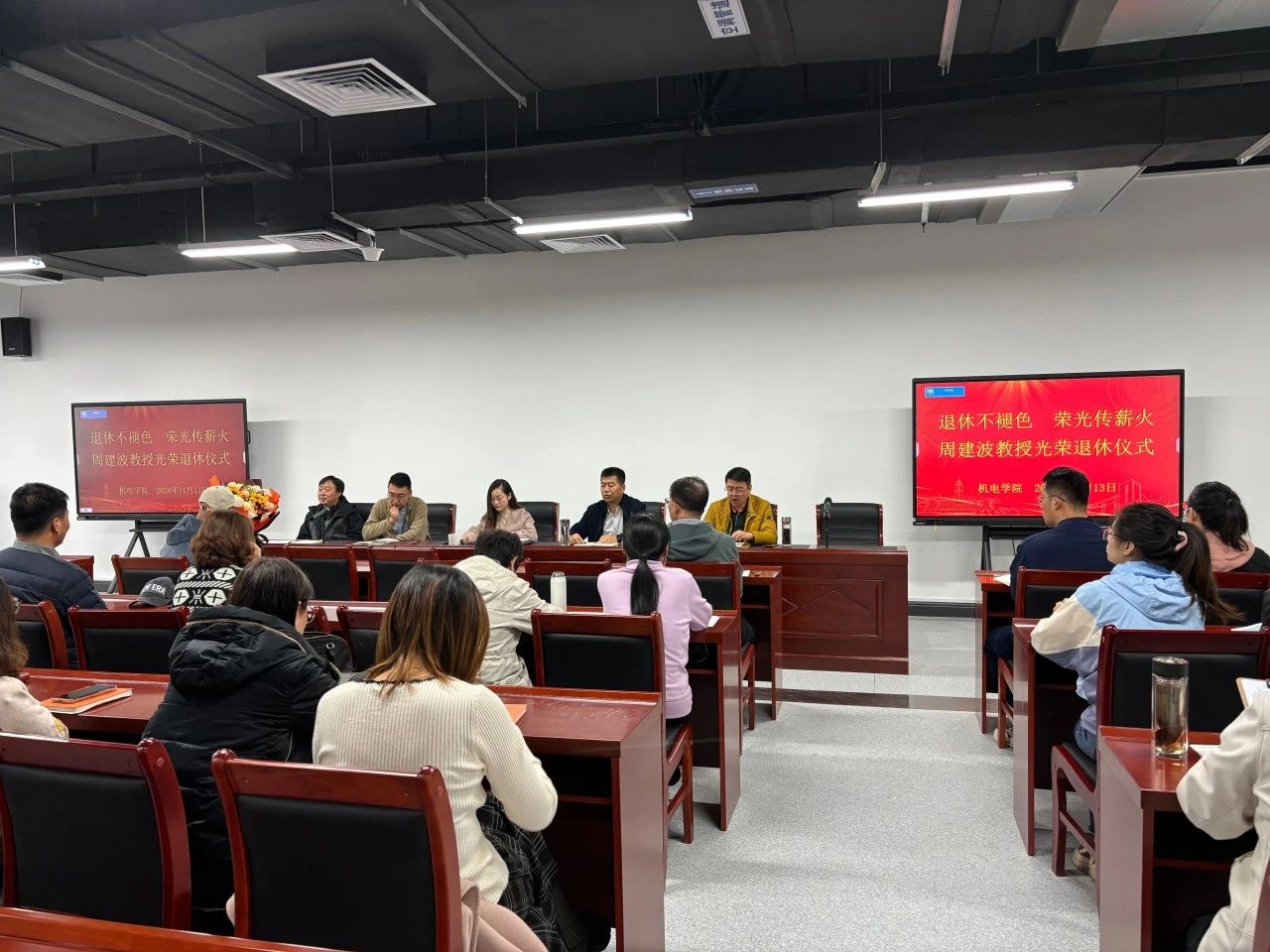 为深入学习贯彻党的二十届三中全会精神,推动落实全国教育大会精神,大力弘扬教育家精神和尊师重教优良传统,着力加强师德师风建设,增强学院教师的归属感、使命感和荣誉感,机电学院于11月13日在智能制造产教融合实训中心会议室举行“传承匠心 共育桃李”老教师荣休仪式暨新教师入职仪式。学院班子成员、2024年荣休教师、新入职教师以及学院全体教师共同参加仪式,仪式由学院党委书记司炜主持。