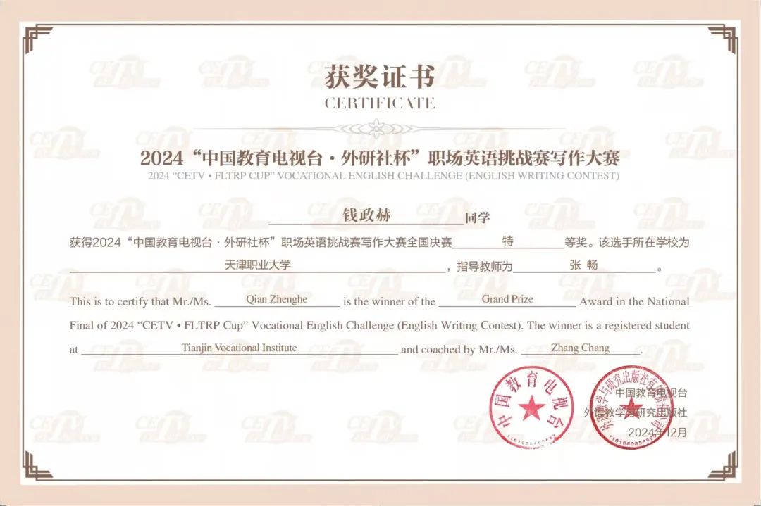 12月8日,2024“中国教育电视台·外研社杯”职场英语挑战赛写作大赛全国决赛云端成功举办。来自全国28个省、自治区、直辖市的90名优秀职教学子,以笔为锋,尽展文思,最终决出全国特等奖10名,全国一等奖15名,全国二等奖25名,全国三等奖39名。beat36523级广告3班钱政赫同学表现优异,荣获写作大赛全国特等奖、天津市特等奖,创造近年最好成绩。