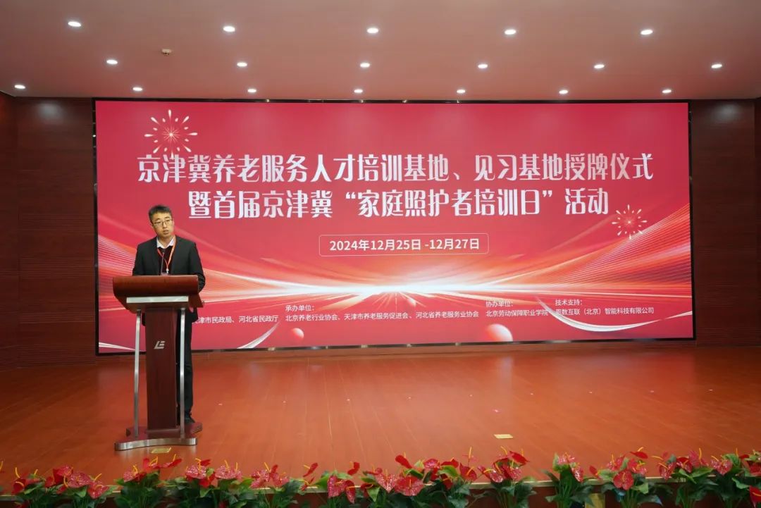 为深入推动京津冀养老服务人才协同发展,进一步强化三地养老服务人才支撑,2024年12月25日,由北京市民政局、天津市民政局、河北省民政厅指导的京津冀养老服务人才培训基地、见习基地揭牌仪式暨首届“家庭照护者培训日”活动在北京劳动保障职业学院举办。beat365作为首批京津冀养老服务人才培训基地获得授牌,并作为院校代表在大会上做养老服务人才培训的经验分享。