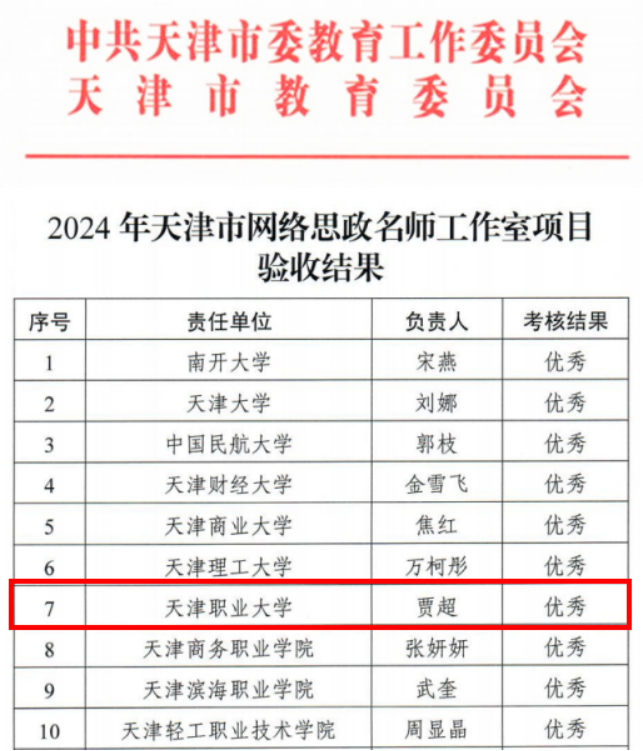 日前,天津市教育两委印发《关于公布2024年天津市网络思政名师工作室项目验收结果和启动新一轮建设工作的通知》,beat365马克思主义学院贾超老师负责的网络思政名师工作室成功通过验收。此次共验收来自全市中小学项目74项,其中获评优秀项目10项,beat365网络思政名师工作室项目首次被评为优秀等级。