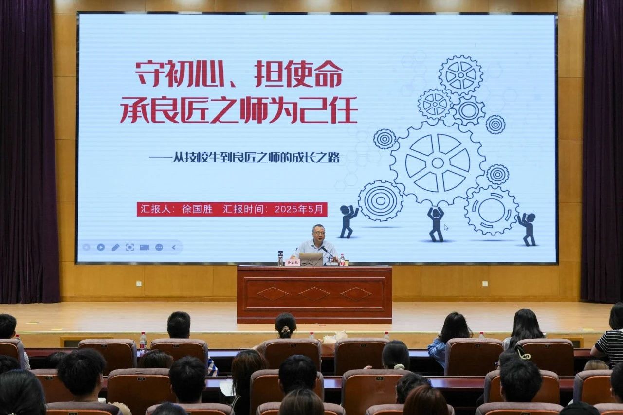 报告会现场,徐教授以《守初心、担使命,承良匠之师为己任》为主题,从个人求学工作履历、荣誉成就讲起,结合梦想与责任的价值叩问、关键节点的人生抉择,以及逐梦路上的成长足迹,将一名普通技校生蜕变为“大国工匠”的奋斗历程娓娓道来。徐教授勉励青年学子要夯实专业根基,锤炼一专多能的过硬本领,在成长道路上保持勤学善思、知行合一的优良作风,传承和弘扬新时代工匠精神,努力成长为堪当民族复兴重任的时代新人。