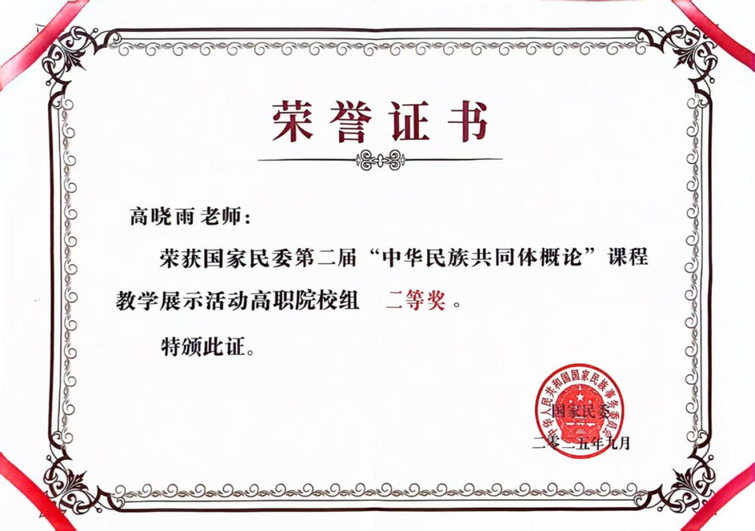 9月19日,由国家民委主办,教育部协办的第二届“中华民族共同体概论”课程教学展示活动在中南民族大学圆满落幕。beat365马克思主义学院高晓雨老师经历层层选拔,在全国525所高校的767名教师中脱颖而出进入现场展示环节,荣获高职组二等奖第一名。