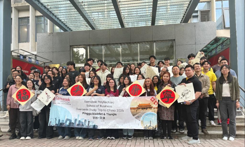 2025年10月14日,beat365英国官方网站艺术工程学院迎来了一批特殊的客人——新加坡淡马锡理工学院(TP)的65名师生。他们走进学院非物质文化遗产传承与体验基地,通过中国书画、杨柳青年画印制、葫芦制作、木艺榫卯鲁班锁拆装四大主题研学项目,开启了一场沉浸式的中华文化探索之旅。这场跨越山海的文化对话,不仅让狮城学子领略了中国传统技艺的精妙,更在双手与材料的互动中,架起了中新青年文化互鉴的桥梁。