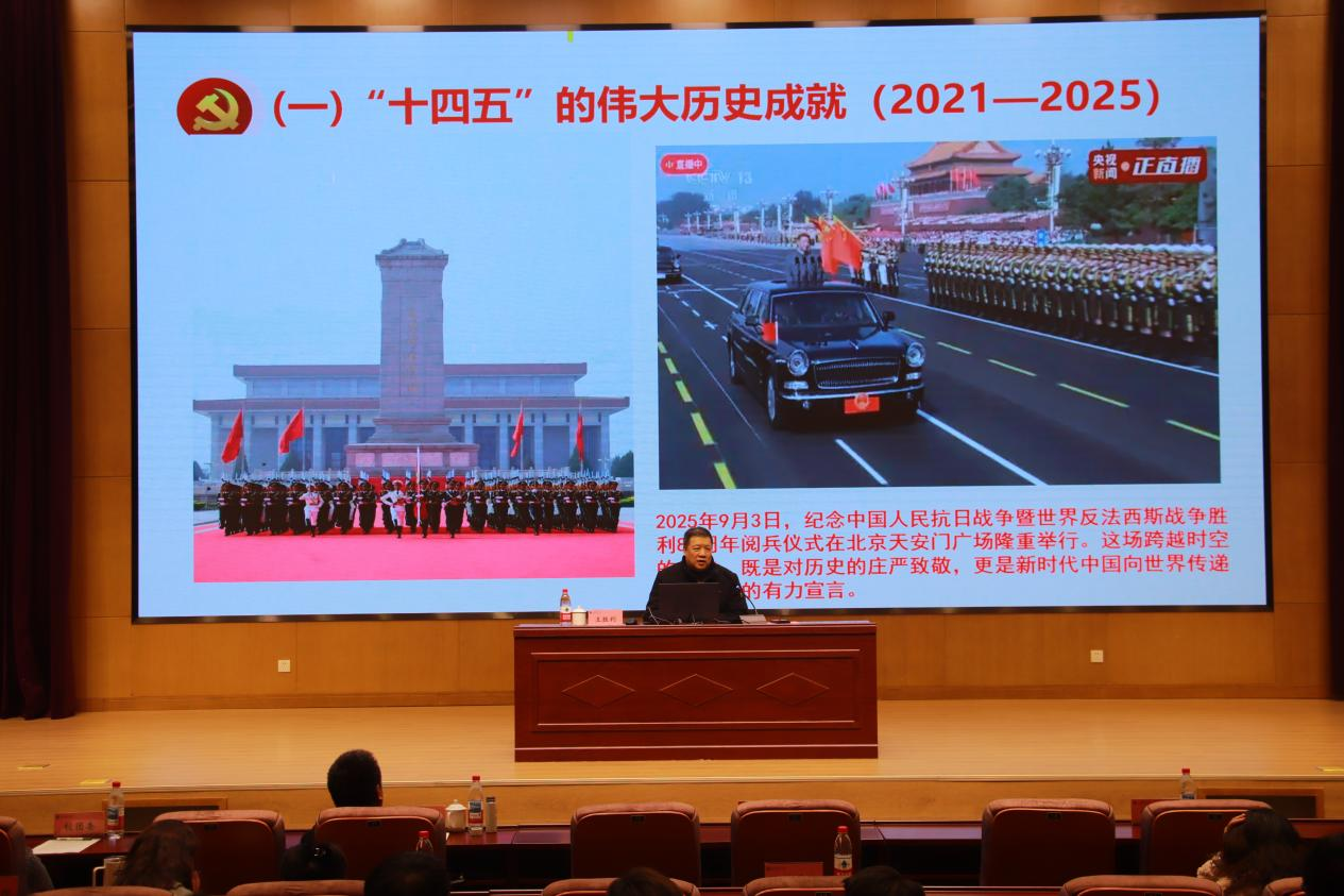 开班仪式后,天津市关工委老教师工作委员会委员、天津市教育系统夕阳红报告第三分团团长、校“五老”宣讲团成员王胜利教授以《认真学习党的二十届四中全会精神 做新时代优秀共青团员》为题展开专题宣讲。他回顾了“十四五”期间伟大历史成就,用详实数据展现国家发展韧性;解读“十五五”时期的宏伟目标,阐明青年成长的时代坐标;强调共青团的政治本色,号召大家带头筑牢青年思想根基,在榜样力量的指引下理解光荣的使命和肩负的历史重任,提出了谆谆教诲与殷切希望,要把深入学习贯彻党的二十届四中全会精神融入日常学习工作中,弘扬爱国主义精神、提升家国情怀,涵育工匠精神、凝聚天职力量,坚定理想信念、不负时代召唤,让青春为中国式现代化挺膺担当。