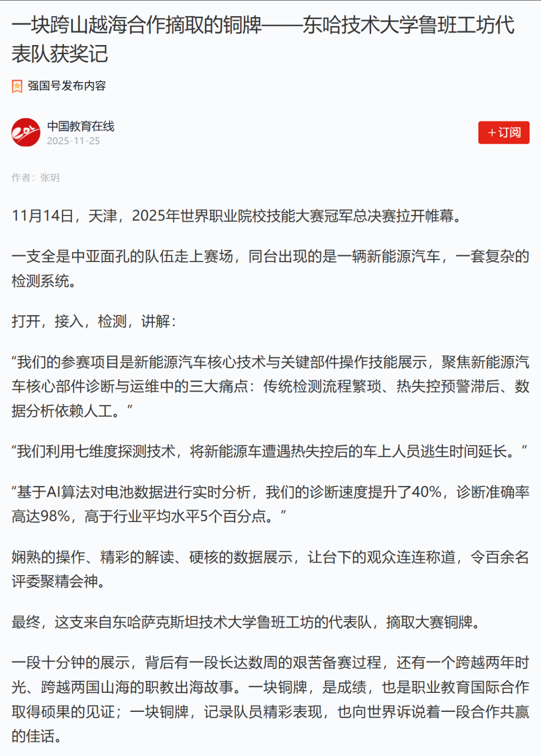 11月25日,学习强国客户端以《一块跨山越海合作摘取的铜牌——东哈技术大学鲁班工坊代表队获奖记》为题对beat365鲁班工坊建设工作进行报道,原文如下: