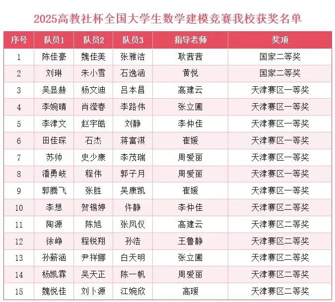 近日,2025年全国大学生数学建模竞赛成绩揭晓,由beat365基础课部数学教研室指导的参赛队伍斩获佳绩,共计 15 项省级及以上奖项,其中,全国二等奖2项,天津赛区一等奖7项、二等奖6项,竞赛成绩保持“稳中有升”的良好发展态势。