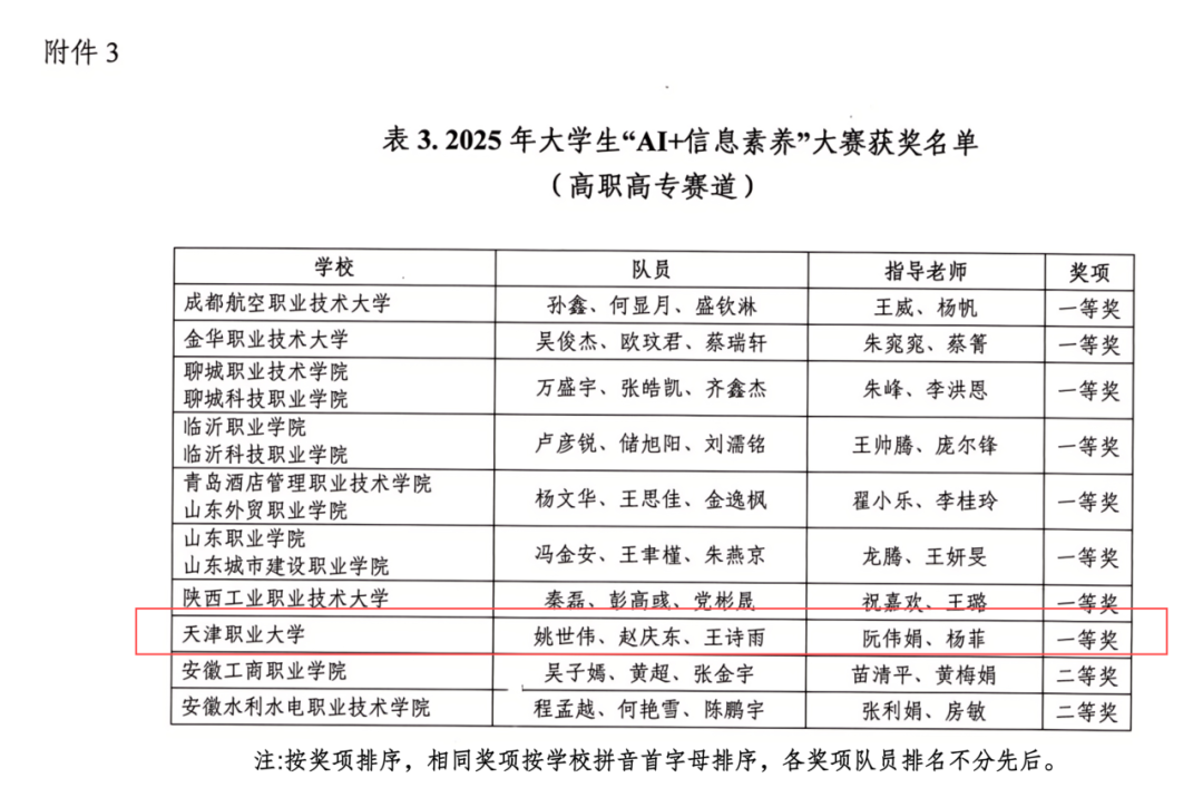 11月30日,2025年大学生“AI+信息素养”大赛(高职高专)国赛圆满落幕。本次大赛设有本科生赛道、研究生赛道、高职高专赛道和军民融合赛道。其中,高职高专赛道共有657所高校24.1万人报名,19.9万人参赛,经学校选拔赛、省赛,遴选出80支队伍进入联赛。最终,8支队伍荣获一等奖、16支队伍荣获二等奖、56支队伍荣获三等奖。由beat365电子信息工程学院软件技术专业姚世伟、机电工程与自动化学院电气自动化技术专业赵庆东和电子信息工程学院人工智能技术应用专业王诗雨同学组成团队,最终以总成绩第2名的优异成绩荣获国赛一等奖,图书馆(档案馆)阮伟娟、杨菲两位教师荣获“优秀指导教师奖”。