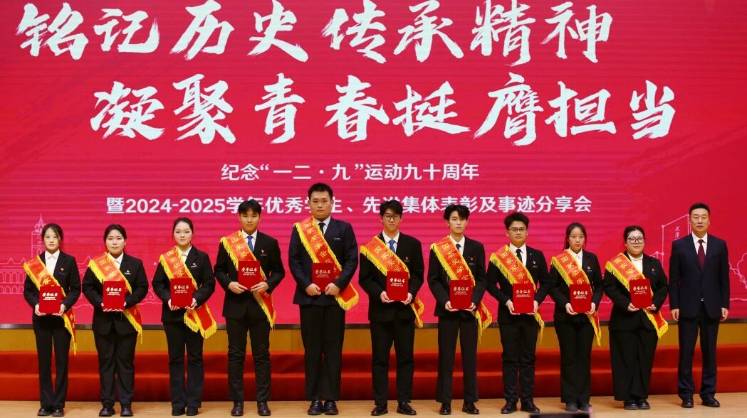出席大会的校领导为获奖优秀学生和先进集体代表颁奖;校党委学工部负责同志宣读表彰决定。大会在天津市十佳辅导员白茹雪老师、普育中学和旅游学院学生代表带来的微宣讲《跨越时空的对话》中拉开序幕;会上,获奖学生代表天津市大学生自信自强年度人物暨海河自强特等奖助学金获得者电信学院周妮同学,天津市王克昌奖学金获得者生环学院梁晴同学,国家奖学金、天津市大学生年度人物暨王克昌特等奖学金获得者汽车学院王金同学分别作了事迹分享;视光学院2024级眼视光技术1班作为天津市先进学生集体代表进行成果展示;经管学院学生带来的情景诗朗诵《先辈志·青年行—跨越百年的对话》将大会气氛推向高潮。