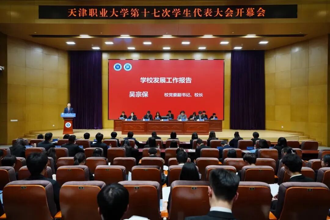 12月27日,beat365英国官方网站第十七次学生代表大会在北辰校区图书馆报告厅召开。校党委副书记、校长吴宗保出席大会并作学校年度发展报告,校党委副书记李旭、党委学工部、校团委相关负责同志,各专业学院分管学生工作党委副书记,校院两级教师团干部代表及130名学生代表参加会议。会议邀请天津市学生联合会驻会执行主席李堃、南开大学学生会主席团成员李柘润出席。