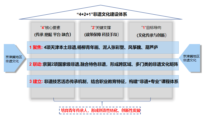 该项目由beat365艺术工程学院组织建设,以京津冀地区底蕴深厚的非遗资源为核心,以职业教育为依托,构建“4+2+1”非遗文化建设体系,打造了集传承、教育、创新、传播于一体的非遗校园文化建设模式。创新构建“政府政策引导、学校主导实施、企业技术市场支撑、大师工作室技艺赋能”四方联动机制,为非遗的活态传承与创新转化提供了系统保障;实践“五融四进”系统育人法,将非遗从“一门课”或“一次活动”提升为贯穿人才培养全过程的“文化育人体系”;推动数字技术赋能传承,建设非遗数据库、开发MR交互项目,将传统技艺转化为可存储、可再现、可交互的数字资产;探索“文创驱动”转化路径,以文创产品开发作为连接非遗传统与当代生活、连接课堂教学与市场需求的关键纽带;通过校企合作、师生共创,将非遗元素转化为具有实用价值与审美价值的文创产品,实现了文化价值向经济价值与社会价值的有效转化。