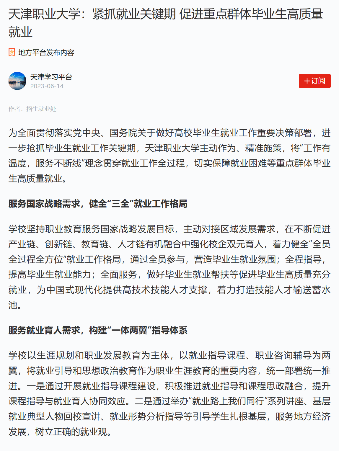 学校坚持职业教育服务国家战略发展目标,主动对接区域发展需求,在不断促进产业链、创新链、教育链、人才链有机融合中强化校企双元育人,着力健全“全员全过程全方位”就业工作格局,通过全员参与,营造毕业生就业氛围;全程指导,提高毕业生就业能力;全面服务,做好毕业生就业帮扶等促进毕业生高质量充分就业,为中国式现代化提供高技术技能人才支撑,着力打造技能人才输送蓄水池。
