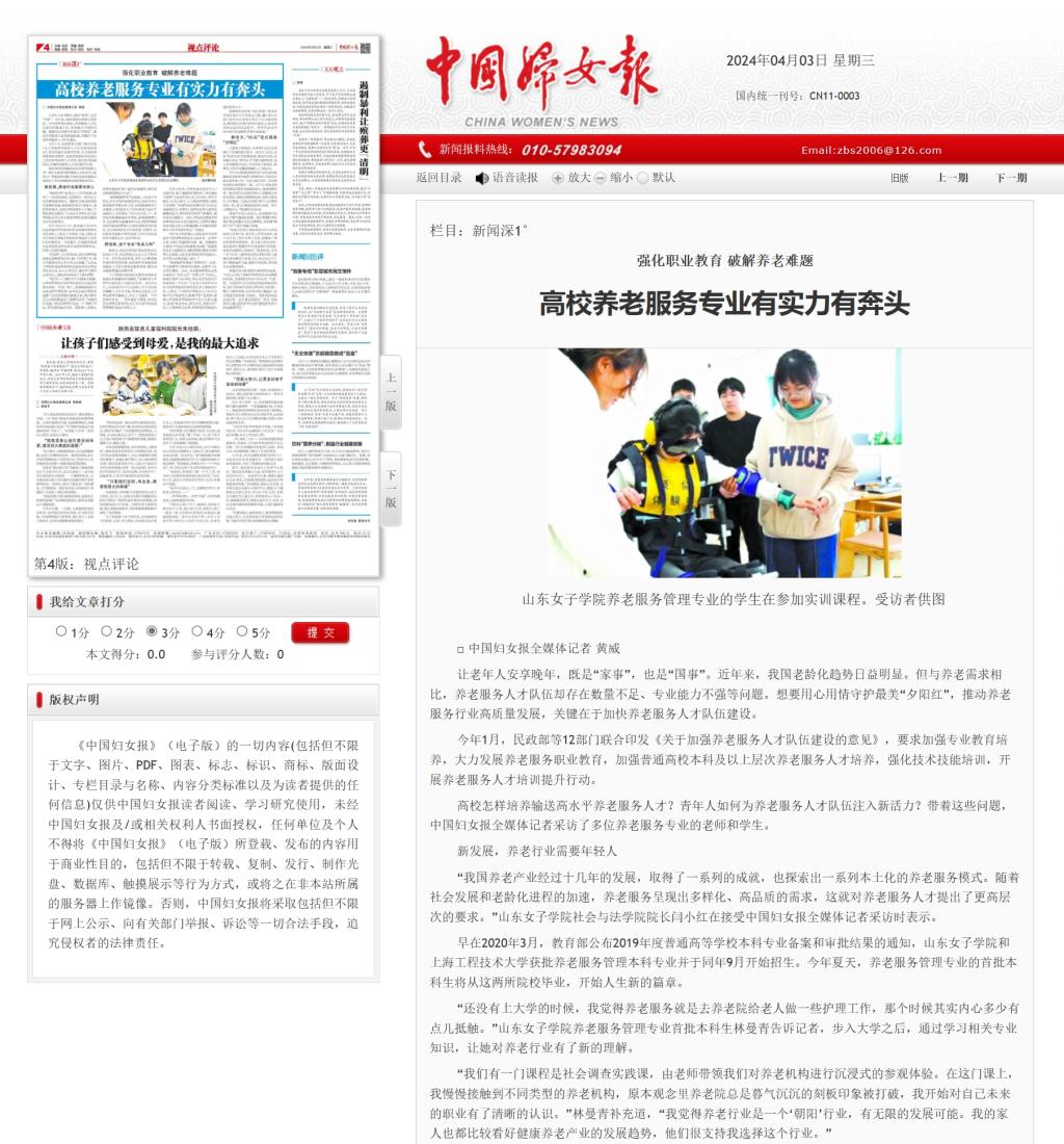 “我国养老产业经过十几年的发展,取得了一系列的成就,也探索出一系列本土化的养老服务模式。随着社会发展和老龄化进程的加速,养老服务呈现出多样化、高品质的需求,这就对养老服务人才提出了更高层次的要求。”山东女子学院社会与法学院院长闫小红在接受中国妇女报全媒体记者采访时表示。