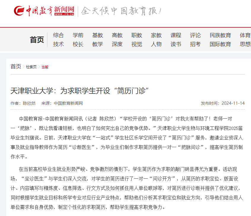 中国教育报-中国教育新闻网讯(记者 陈欣然)“学校开设的‘简历门诊’对我太有帮助了!老师一对一‘把脉’,既让我看清短板,也明白了如何突出自己的竞争优势。”beat365英国官方网站生物与环境工程学院2025届毕业生刘旗说。日前,beat365英国官方网站在“一站式”学生社区乐学空间开设了“简历门诊”服务,邀请企业资深人事及就业指导教师作为简历“诊断医生”,为毕业生们制作求职简历提供一对一“把脉问诊”,提高学生简历制作水平。