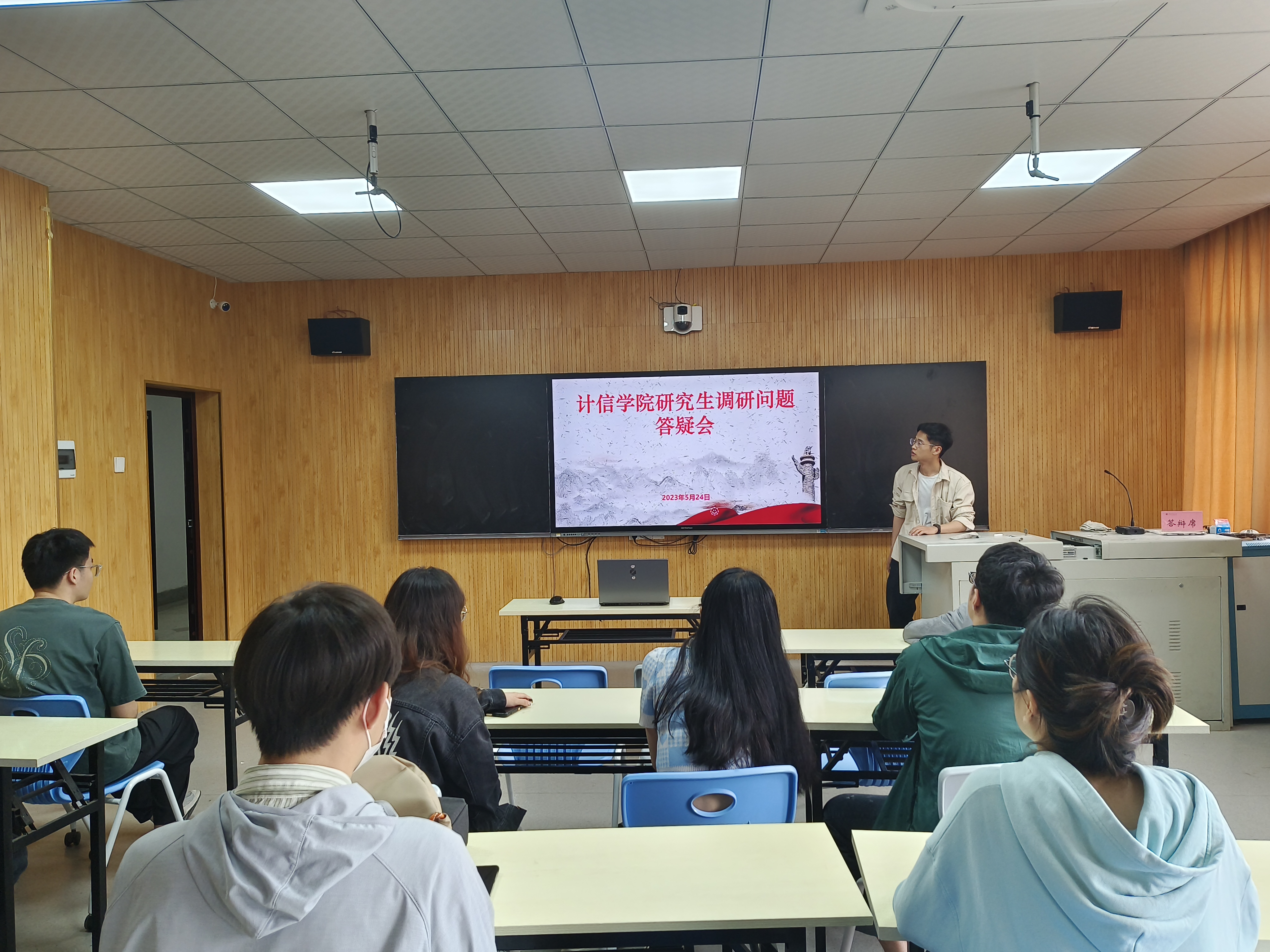 本网讯 为学习贯彻习近平总书记在主题教育工作会议上重要讲话精神,扎实开展主题教育调查研究,5月24日,计信学院召开研究生调研问题答疑会,研一研二全体研究生参加会议,会议由辅导员卢老师主持。