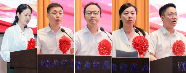 优秀共产党员师德先锋之星代表马克思主义学院陈克娥,优秀共产党员管理服务先锋之星代表后勤集团鄢啸,优秀共产党员学业先锋之星代表学生张琦,优秀党务工作者代表音乐学院杨娇,先进基层党组织代表教育科学学院王浩先后作了交流发言。