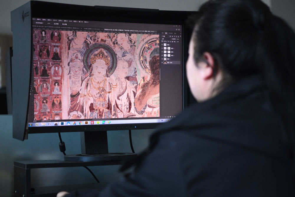 敦煌研究院文物数字化保护团队图像处理人员年海丽在拼接壁画图像(2023425日摄)。数字化探索为莫高窟的保护与传承开辟了全新路径,数字技术让敦煌文物走出洞窟,跨出国门,走向“永久保存、永续利用”。新华社记者 陈斌 摄